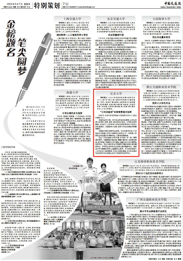近日,《中国交通报》刊发题为《金榜题名 笔尖圆梦》的专版报道,展示长安大学招生亮点、特色专业等家长关注的热点,并特别报道开元娱乐城