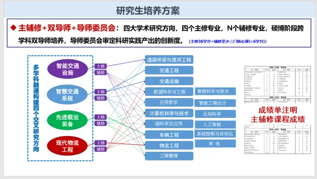 研究生培养方案立足培养未来交通科技领军人才的目标定位,紧扣未来交通领域可能面临的难题与“卡脖子”技术,在强化课程思政及其价值引领效能基础上,构建厚基础、宽口径、深融合、强创新、重产出的研究生课程体系,着重培养研究生的家国情怀、前瞻意识、科技创新能力和可持续发展能力,培养中国特色的国际化交通科技拔尖创新人才。