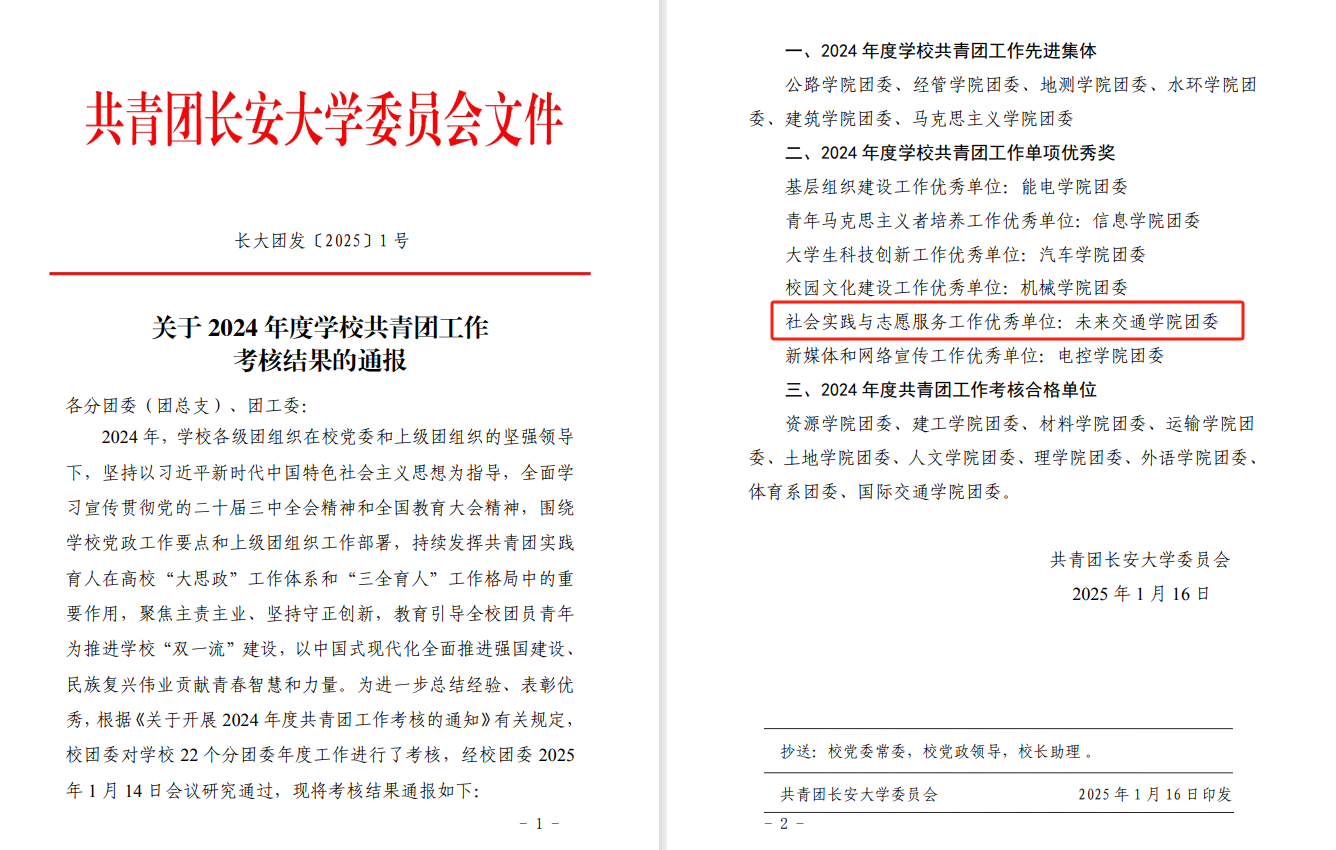 近日,共青团长安大学委员会印发《关于2024年度开元娱乐城 共青团工作考核结果的通报》,开元娱乐城 荣获单项优秀奖,被评为社会实践与志愿服务工作优秀单位