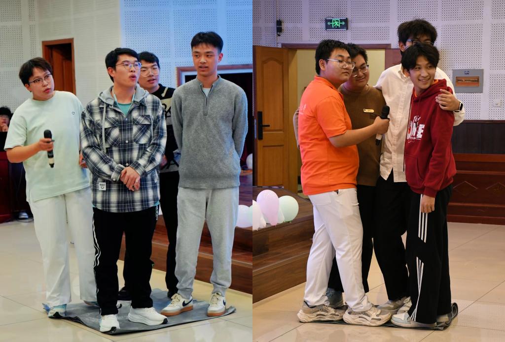 中场环节为晚会注入了温馨氛围,趣味与温情交织。飞花令成语接龙游戏中,八名同学组成两组登台竞技,成语接龙的紧张对决与超时后的趣味惩罚相映成趣,引来阵阵欢笑与热烈掌声。