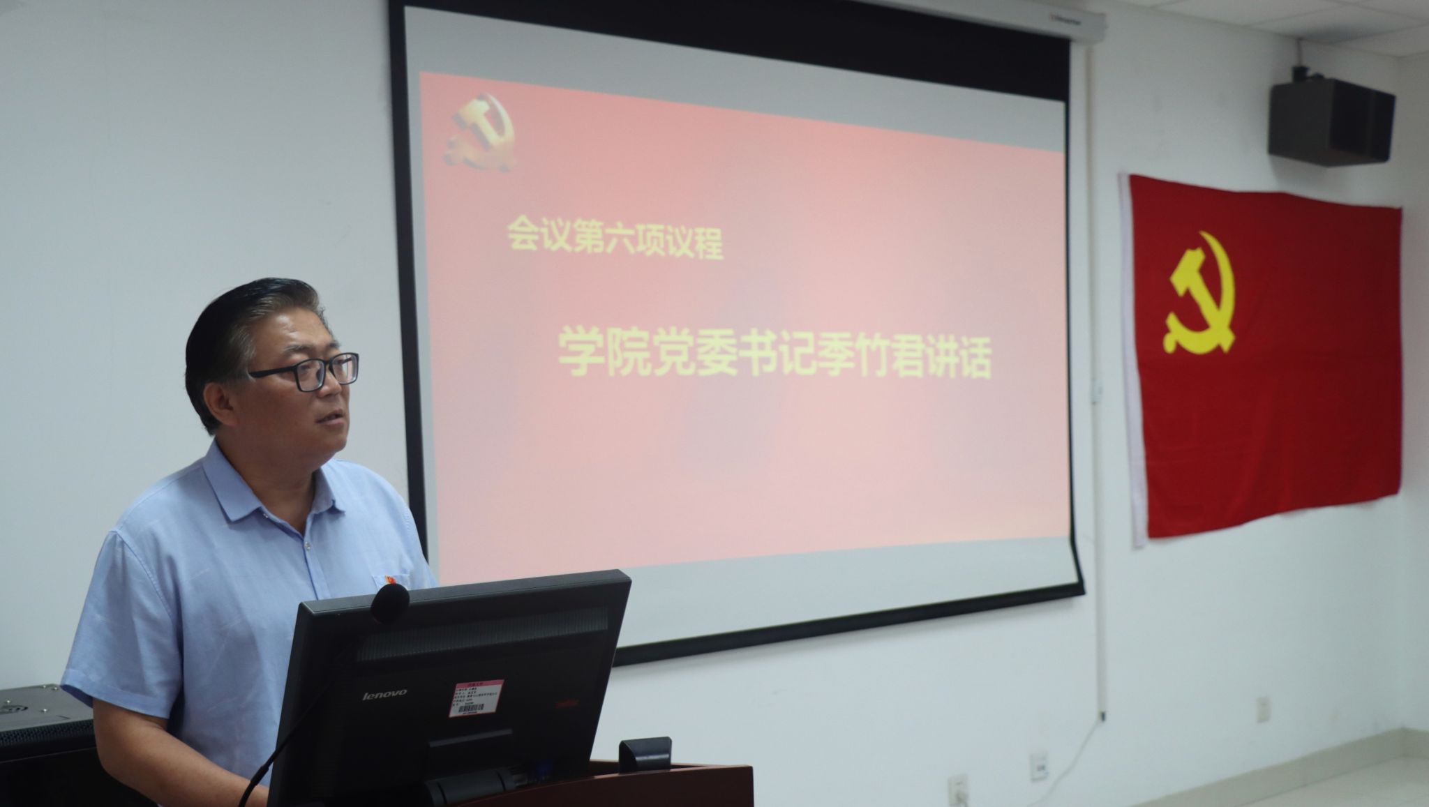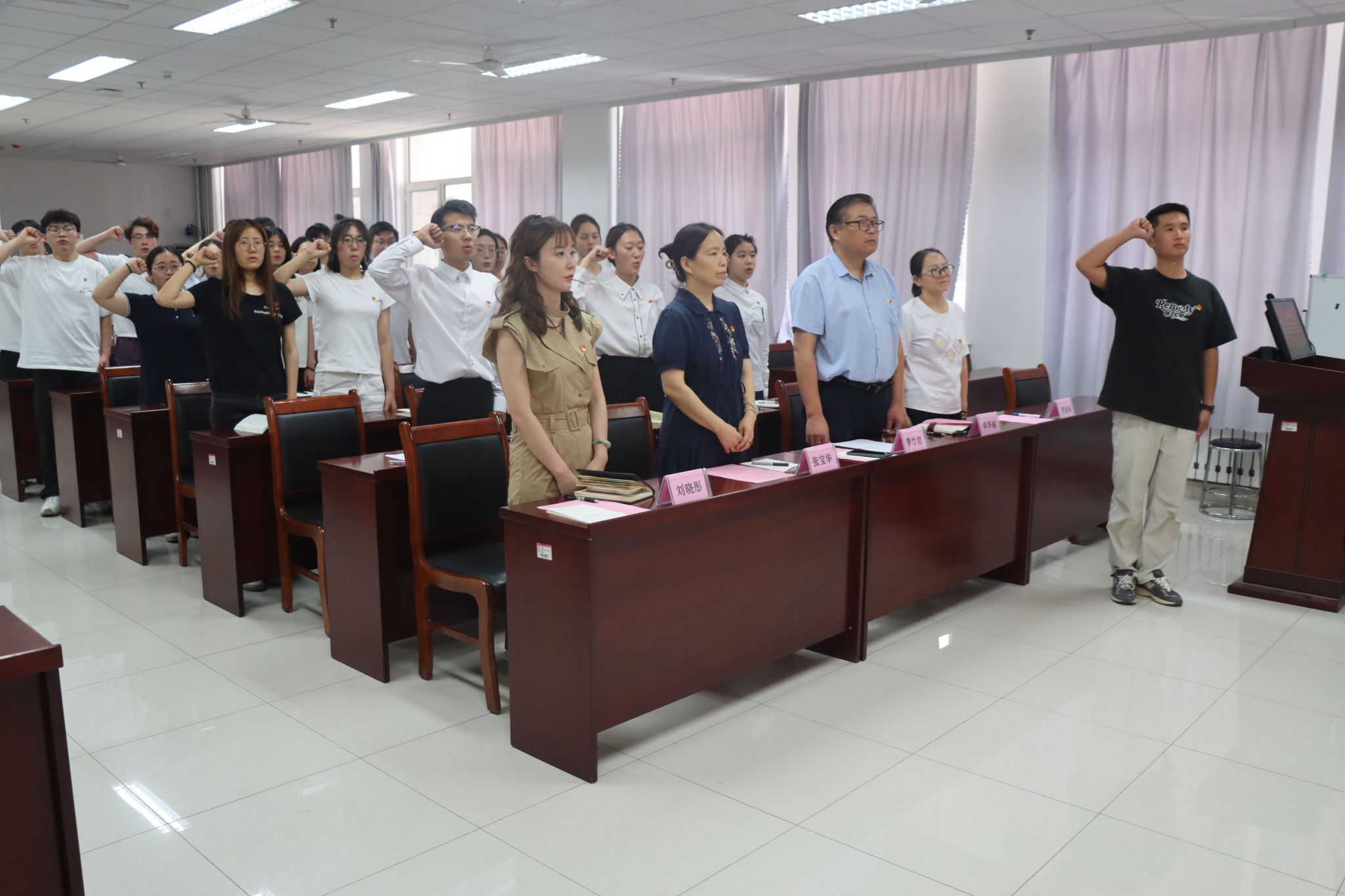 党委书记季竹君,组织委员张宝华,学生支部书记卓华丽、刘晓彤,本学期28名新发展预备党员和优秀党员代表参加仪式,学生支部书记曹丽丽主持仪式。