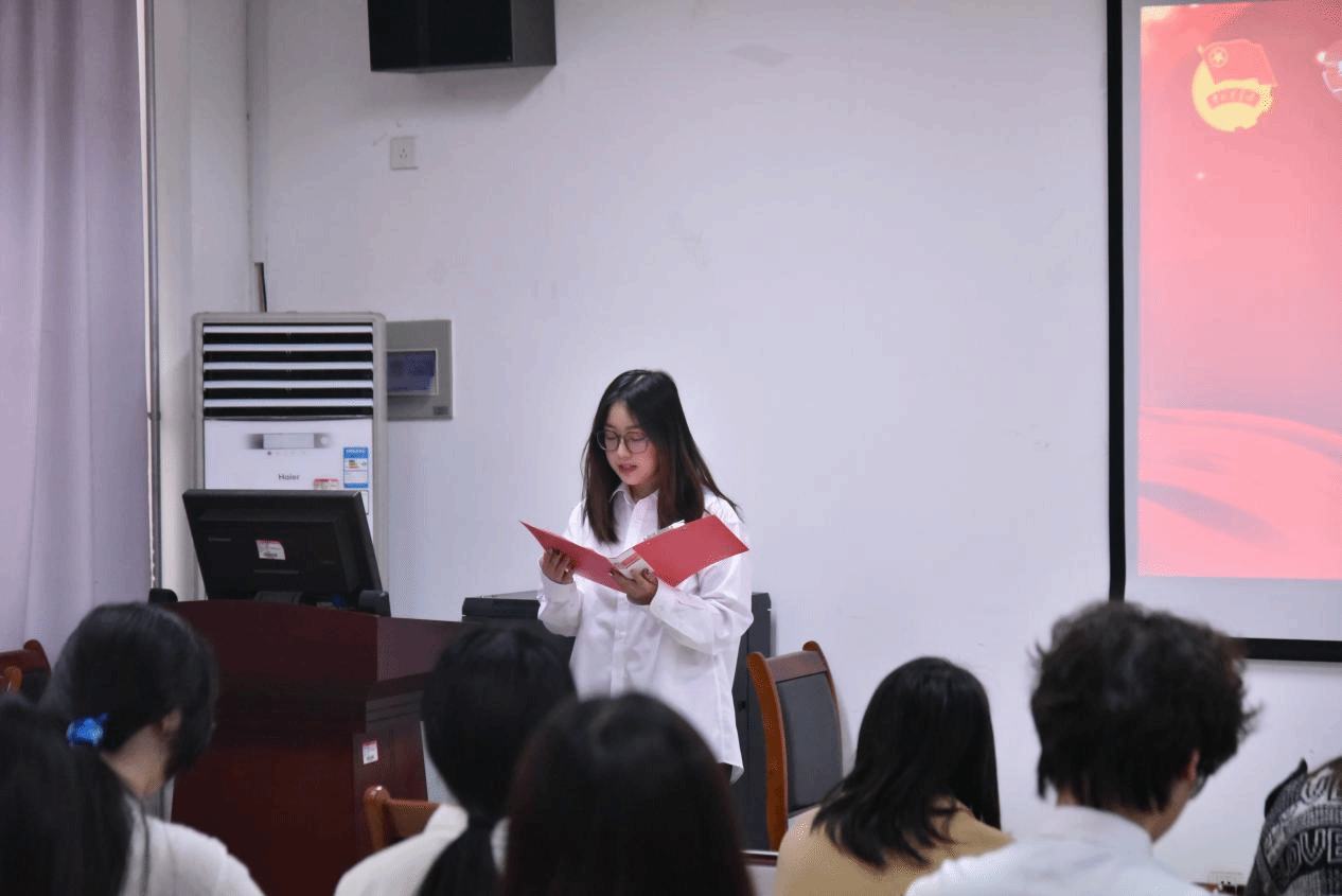 随后,由团学部刘卓然同学领誓,新发展团员进行了庄严的宣誓仪式。李响和田欣冉同学分别作为新发展团员代表和优秀团员代表进行发言。