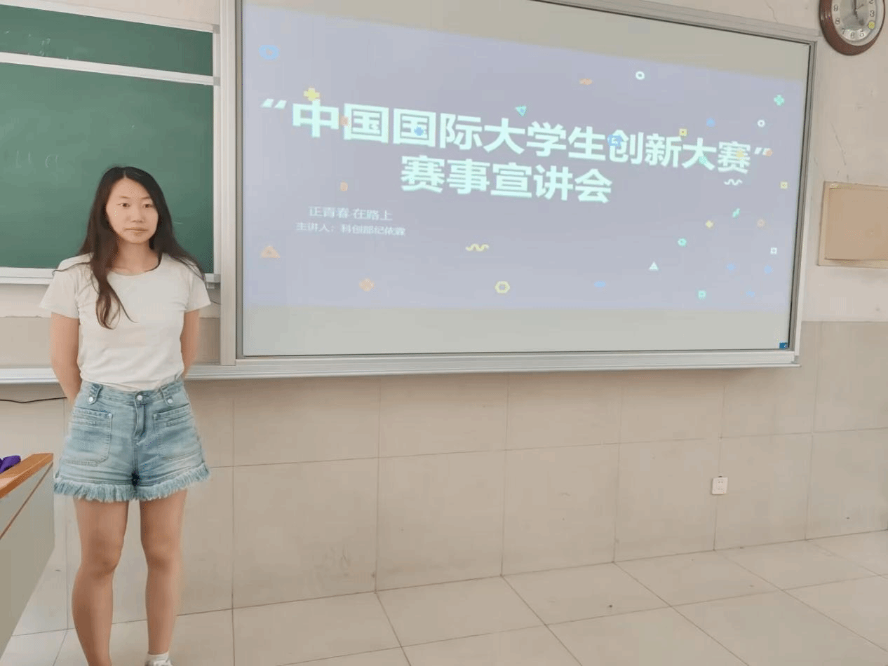 学生进行了“中国国际大学生创新大赛”的线下赛事介绍,活动由科创部干事纪依霖主讲。