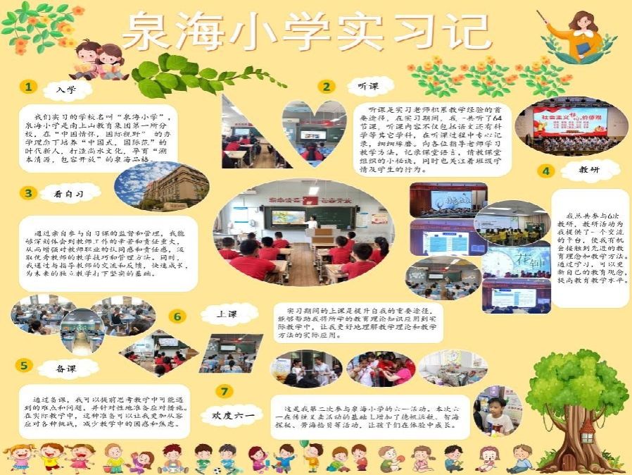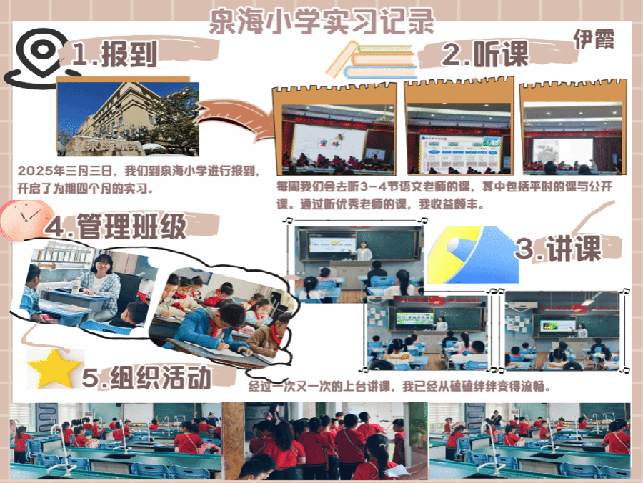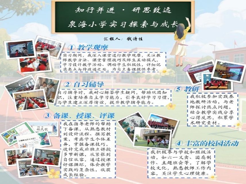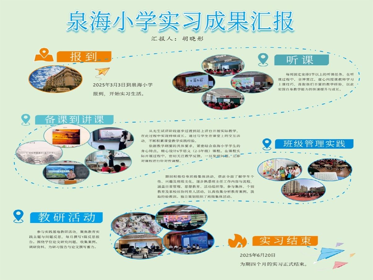 2023级5位小学教育领域研究生怀揣教育热忱,走进泉海小学,开启了一段从“理论探索者”到“实践引路人”的成长之旅。在鲜活的教育场景中,5位研究生严于律己、以身作则,以“准教师”身份深度融入校园生活。实习期间,她们立足小学学段特点,将教育学原理与儿童认知规律相结合,在语文课上以情境教学唤醒阅读热情,在数学课中用生活化案例破解抽象概念,在班队活动中以童心视角设计成长课程,运用多媒体工具打造“互动课堂”,让知识在童趣中自然生长。