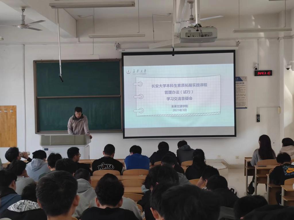 新修订管理办法的实施背景、意义以及课程分类详细讲解了德育实践、美育实践、劳育实践和创新创业实践四个环节的培养方案,并就每一门实践课程的成绩考核及学分认定进行了说明,鼓励每一位同学要积极参加课外实践活动,把第一课堂专业知识融入第二课堂。此外,结合近期即将开展的长安大学第十八届“挑战杯”系列赛事、校园文化艺术系列赛事等活动进行宣讲动员,激发大家的参与热情,在实践中全方位锻炼自我,提升自身软实力。