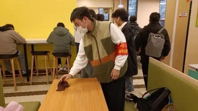 活动筹备前期,院学生会主席团成员李辰垚对本次志愿服务活动进行了总体安排。在餐厅负责人对志愿者进行岗前集体培训后,两组志愿者分别于工作日午餐和晚餐高峰时间段,加入餐厅工作人员队伍。志愿者们分工合作,进入各自的工作岗位,第一小组负责清理用餐人员就餐完毕后桌面上的残留杂物,第二小组志愿者负责打扫洒落在地面上的杂物,第三小组负责高峰时期用餐人员队伍的秩序维护。劳动过后,餐厅地面干净、桌面整洁,志愿者们收获了餐厅工作人员的一致好评。