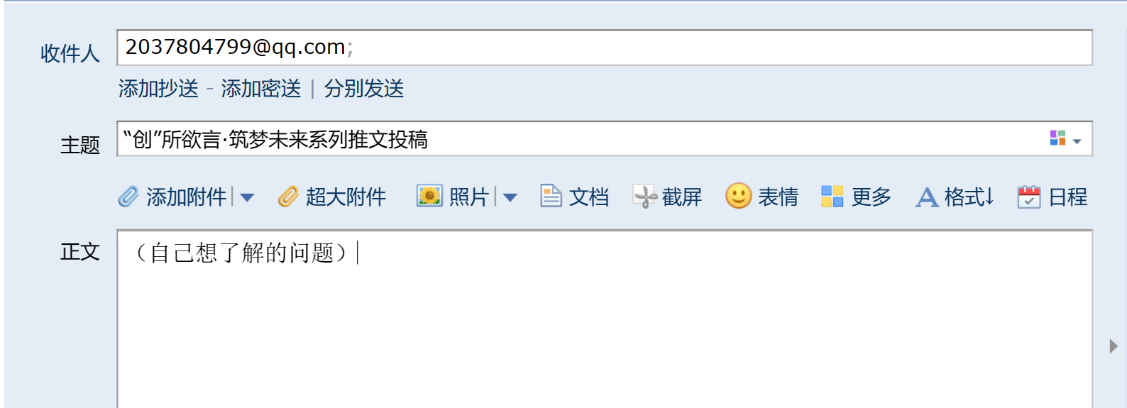 看过各位学长的分享,大家有没有什么收获呢?如果大家在科创方面有什么想了解的问题,可以将自己的问题发送到[email protected],邮件格式如下图。我们下次见面!