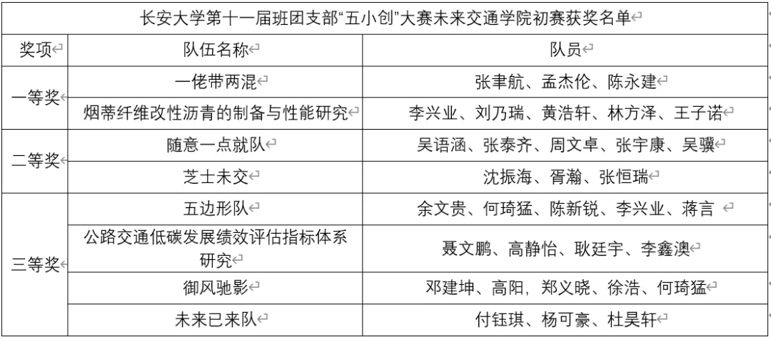 在问答环节,各队就评委提出的问题进行了细致回答与讨论。最终,“一佬带两混队”“烟蒂纤维改性沥青的制备与性能研究队”获得一等奖,“随意一点队”“芝士未交队”获得二等奖,“五边形队”“公路交通低碳发展绩效评估指标体系研究队”“御风驰影队”“未来已来队”获得三等奖。