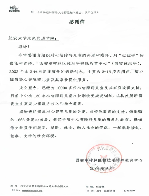 组织学生骨干志愿者团队前往西安市碑林区拉拉手特殊教育中心开展“手牵手传递温暖,心连心共筑未来”志愿服务活动暨大学生志愿服务实践基地揭牌仪式。院团委书记曾晓阳、院青马班学员和院学生会部分成员代表共计12人参加活动。