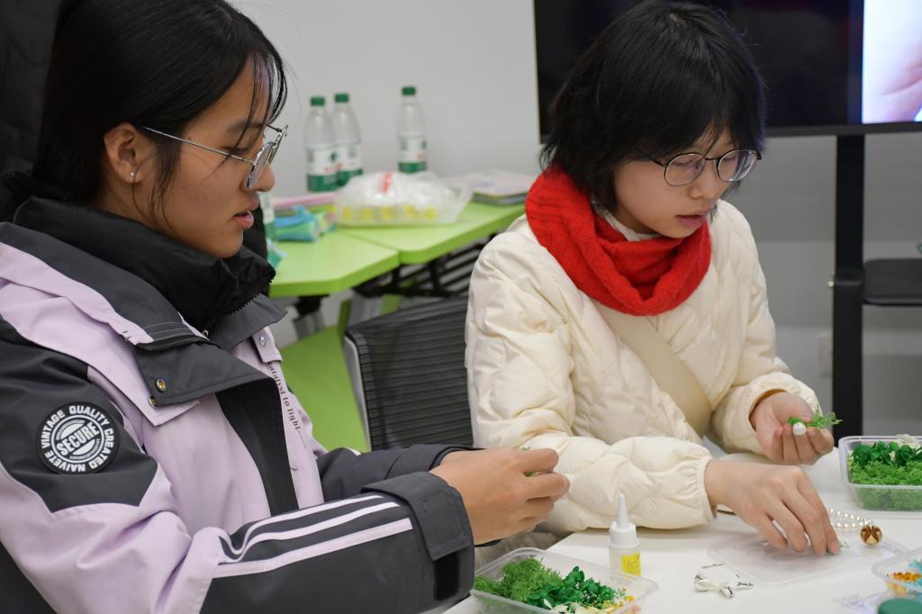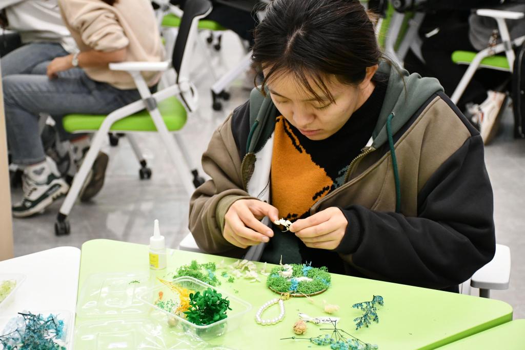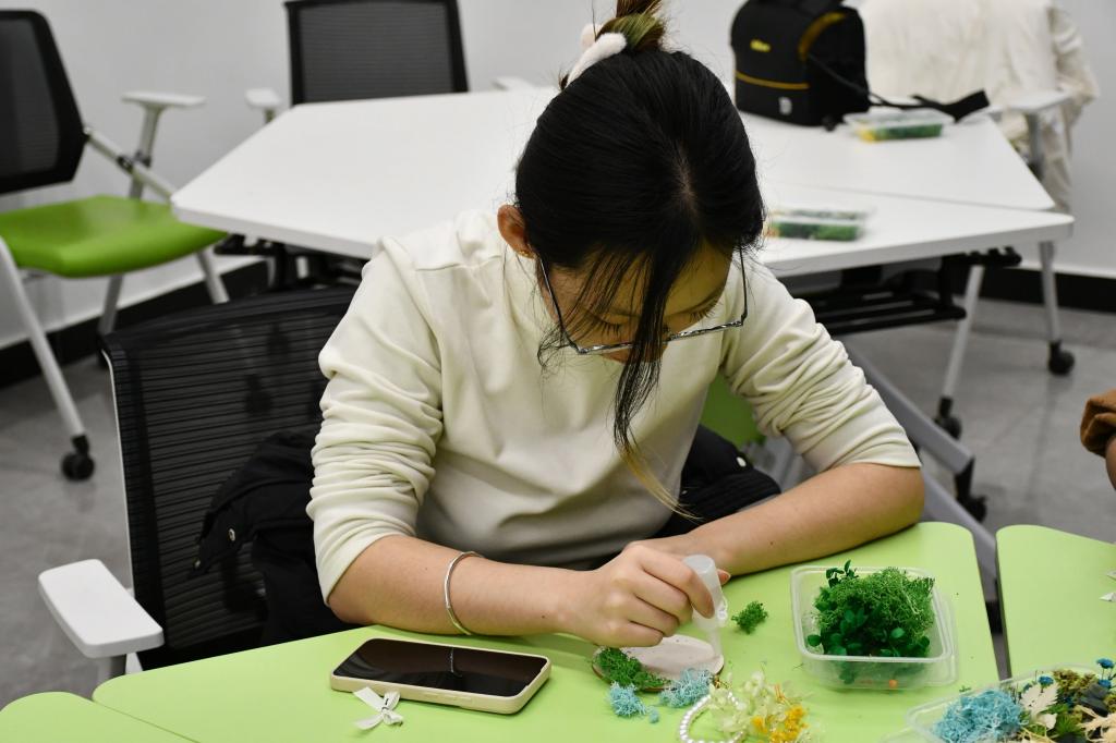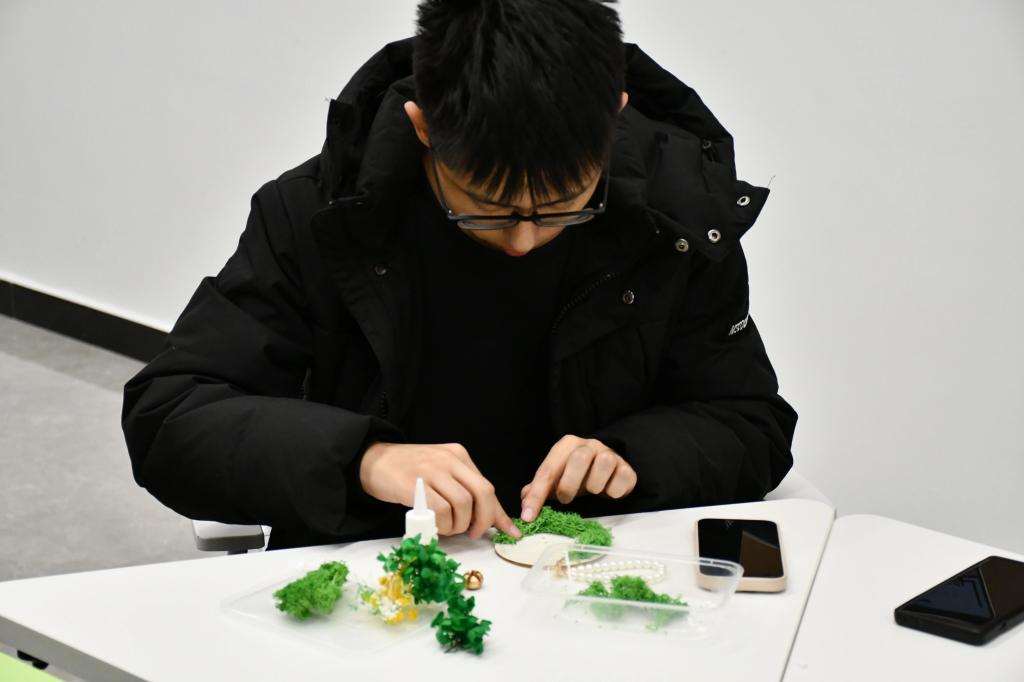 在手工制作环节,同学们领取了对应款式的花盒与各种材料,丰富多样的材料为创意发挥提供了想象的空间。同学们充分发挥想象力与创造力,相互交流分享创意灵感,现场气氛活跃温馨。经过努力,一个个精美绝伦的永生花花环惊艳亮相,每一款都展现出创作者的独特风格与匠心巧思。