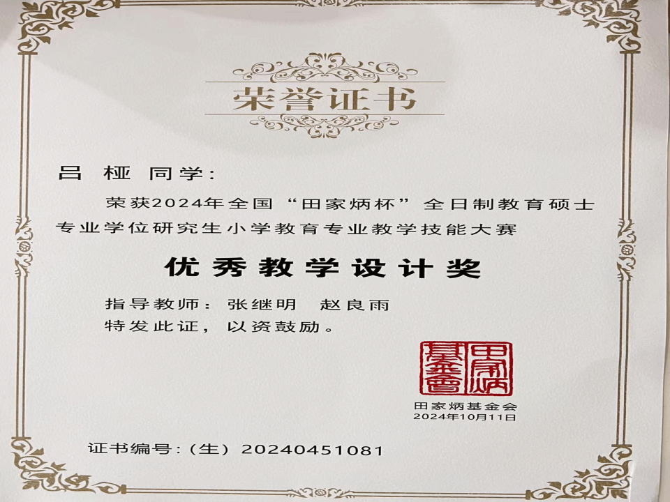 乔福强副教授指导的特殊教育专业研究生董婉晴、侯艳分别荣获全国一等奖、三等奖,张继明副教授指导的小学教育专业研究生吕桠获得“优秀教学设计奖”,乔福强老师获得“优秀指导教师”,开元娱乐城