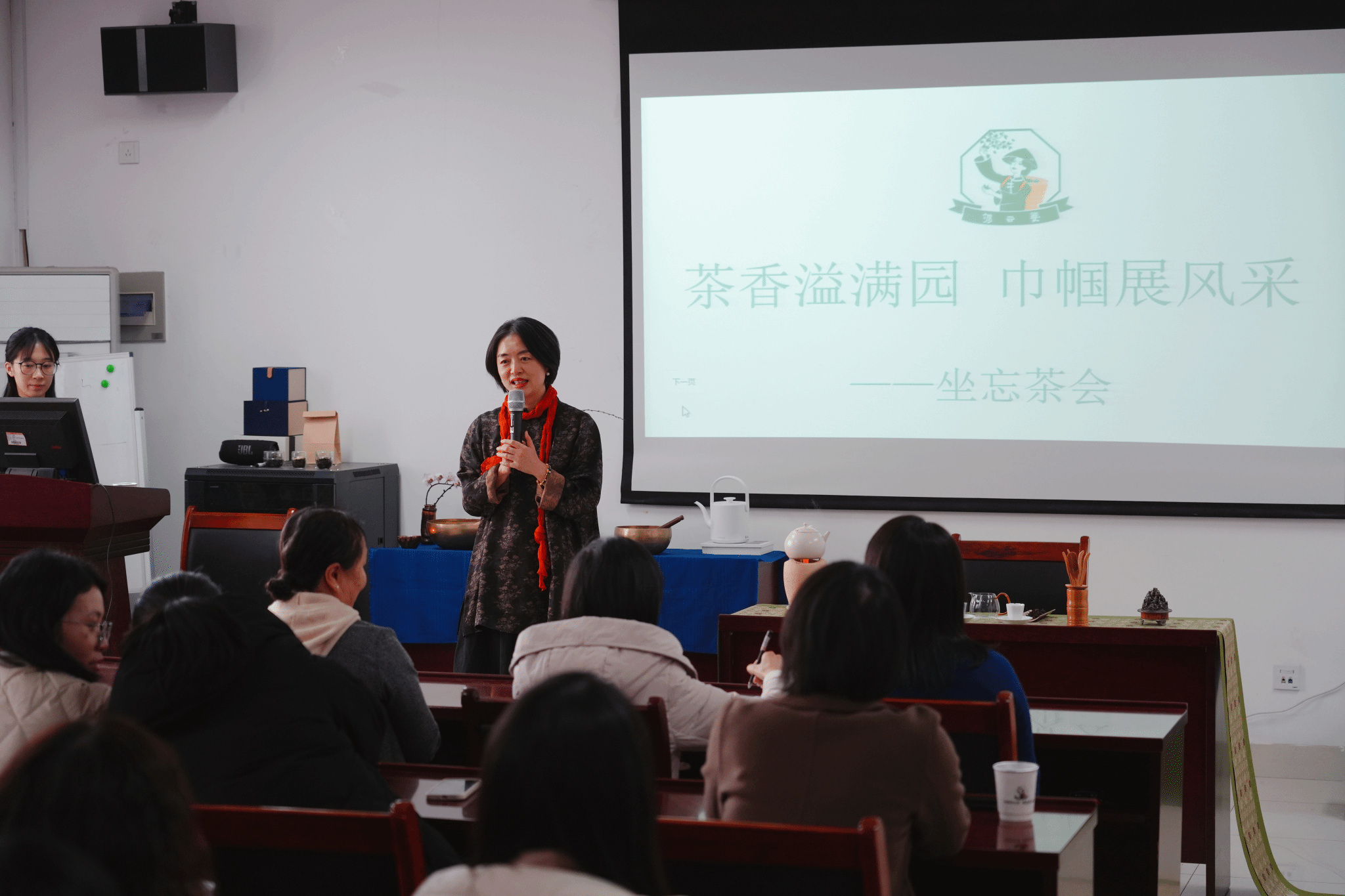 会议室举行,众多女教师齐聚一堂,在茶香四溢中共享美好时光,现场气氛热烈而温馨。