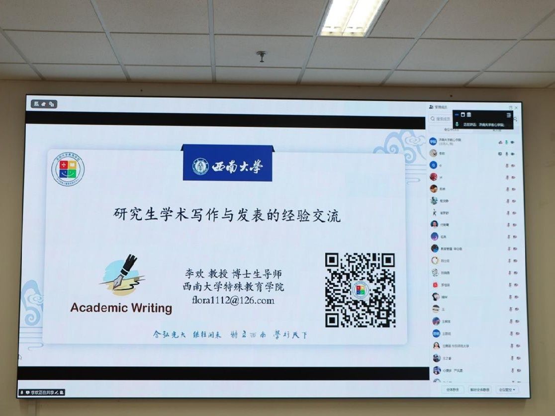陈琦教授率先带来主题为《人类认知的计算建模研究:认知心理学的视角》的报告,从认知心理学维度切入,系统阐释了心理认知过程计算模型的构建逻辑与验证路径,为在场师生打开了认知研究的全新视角;西南大学教育学部李欢教授则聚焦《研究生学术写作与发表的经验交流》,结合自身科研与指导经验,从论文选题、撰写规范到期刊投稿等环节,为研究生学术成果产出提供了实用指引;华东师范大学教育学部王勇丽副教授分享《孤独症儿童情感韵律特征研究进展》,梳理了该领域的前沿成果与实践应用方向,为特殊儿童康复研究提供了重要参考。