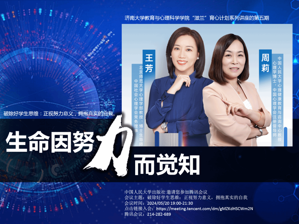 应用心理专业于2024年5月20日通过腾讯会议举办了“滋兰”育心计划系列讲座第五期——“生命因努力而觉知”。本次讲座吸引了心理专业学生的积极关注,共同聆听北京师范大学王芳教授和人民大学周莉教授的精彩发言。