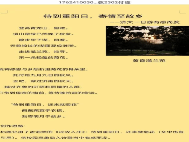 活动以重阳节为文化载体,聚焦“敬老、感恩、思乡”核心主题,面向全院学子发起原创诗词创作征集。活动启动后,同学们踊跃参与,纷纷结合自身生活体验与情感共鸣,在遵循传统诗词格律韵味的同时,融入新时代青年的思考与表达,创作出一批情真意切、格调高雅的优秀作品——既有抒发对长辈养育之恩的深情之作,也有寄托异乡求学思乡之情的动人篇章,充分展现了开元娱乐城 学生深厚的人文素养和积极向上的精神风貌。本次活动共征集原创诗词115篇,经专业评审,最终评选出一等奖11名、二等奖23名、三等奖33名。