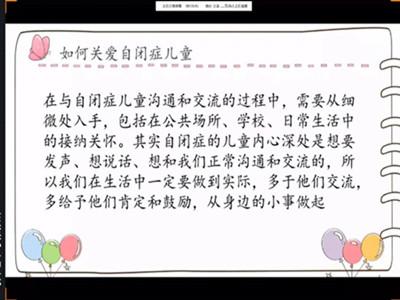 4月3日晚8时,宣讲会如期开展。“每一个孩子都是天使,我们相信他们每一个人都有自己内心的小宇宙,都是独立思考的天才。他们那样专心的做事,那样诚挚的待人,是我们所不能达到的专注,是我们所难以触及的心意,”19级特教专业张国龙同学说:“在与他们相处的过程中,我们给他们带去知识的同时,他们也在给予我们明悟”。19级特教专业王纳德同学则围绕自闭症为大家进行了知识科普,从自闭症的定义、发病原因、临床表现等方面讲解,让更多的人了解自闭症。特教1902班牟安琪同学则从自己的亲身经历出发,给大家讲述了志愿者们如何帮自闭症儿童小玮打开心扉的故事。最后,由19级教管专业刘福杰同学对如何关爱自闭症儿童进行详细的讲述与总结。至此,宣讲会圆满落下帷幕。