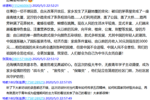 青年志愿者张国龙表示:“沧海横流显英雄本色,最是危难见真诚初心。”在这次防疫大考中,无数青年学子主动请缨,成为家乡疫情防控的“战斗员”、“宣传员”、“保障员”,他们站立在社区前,为社区居民守护防控,“我们要以他们为榜样,将五四精神发扬光大。”;青年志愿者高小婷说:“五四精神让我们深刻认识到自己身上的担当与责任,作为当代青年,我们应当与祖国同呼吸共命运。”她表示,将与其他青年志愿者一起继续努力学习、奋发向上、勇担责任、共筑梦想