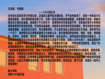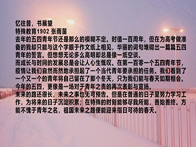 活动期间,参赛者将去年对五四的回忆和今年疫情后的展望用文字表达出来。特教1902班戴文迪同学写到,去年的五四青年节是在备战高考中度过的,虽无聊又疲惫,但是通过“借这个机会想起那段岁月,更多的是感恩和想念,很久没看到这样努力的自己了。”这句话我们能看出,高考前虽然忙碌,但又是充实与满足的一段回忆;特教1902班张雨苗谈到今年五四青年节的特殊,如她所说的“疫情让我们自然而然地承担起了一个当代青年要承担的义务”那样,我们看到了一个又一个青年将自己留在了那个冬天。今年的五四青年节,更像是一场对于青年之责的再次表彰与宣扬。经过作品收集与筛选,教育与心理科学开元娱乐城