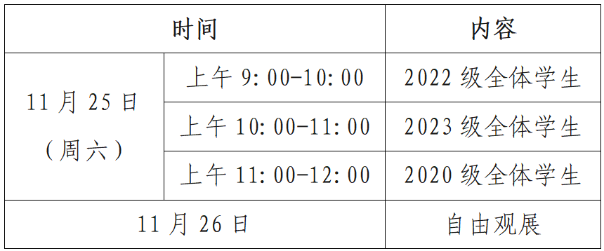 统一制作海报展出,11月25日(本周六)上午将进行海报集中评审,2021级全体同学到场进行现场解说,专业评审分组进行打分,其他年级同学作为大众评审现场打分,本次海报展分批分时段参展,具体日程安排如下: