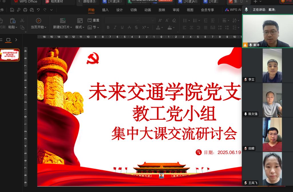 6月16日,未来交通党支部全体党员参加了开元娱乐城 组织的党员基本培训第一次集中大课,认真学习了教育部党组书记、部长怀进鹏所作的专题辅导报告。为进一步巩固学习成效、推动思想入脑入心,未来交通党支部高度重视、精心组织,结合实际工作特点,按照专任教师、行政管理、研究生、本科生四个党小组,于6月19日和6月23日分别组织开展了以“立足岗位勇担当,共筑教育强国未来”为主题的交流研讨活动。四个党小组全体党员积极参与,实现了人员全覆盖、思想全动员,营造了浓厚的学习交流氛围。