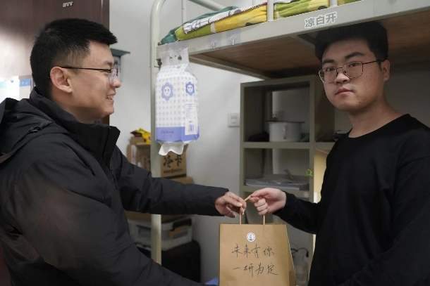 老师与考研学生展开深入交流,充分了解学生们的备考情况和日常需求,勉励考研学子既要明确目标,用持之以恒的态度坚持到底;又要在考研最后的冲刺阶段注意合理饮食、劳逸结合,以充沛的精力和良好的身体状态迎接考试。老师们贴心的关怀与问候,对于不畏严寒、备考热情不减的考研学子而言格外温暖。整个活动伴随着欢笑与浓浓师生情,为冬日校园平添了一道靓丽温暖的风景线。
