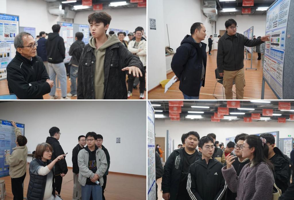 其他年级同学分批到场观展,担任大众评审,从海报内容的创新性、完整性、设计美观度以及现场解说表现等多个维度进行线上评分。观展过程中,同学们积极与参展学长学姐交流探讨,既学习了海报制作与学术展示的技巧,也拓宽了对不同科研方向的认知,现场互动频繁,气氛热烈。